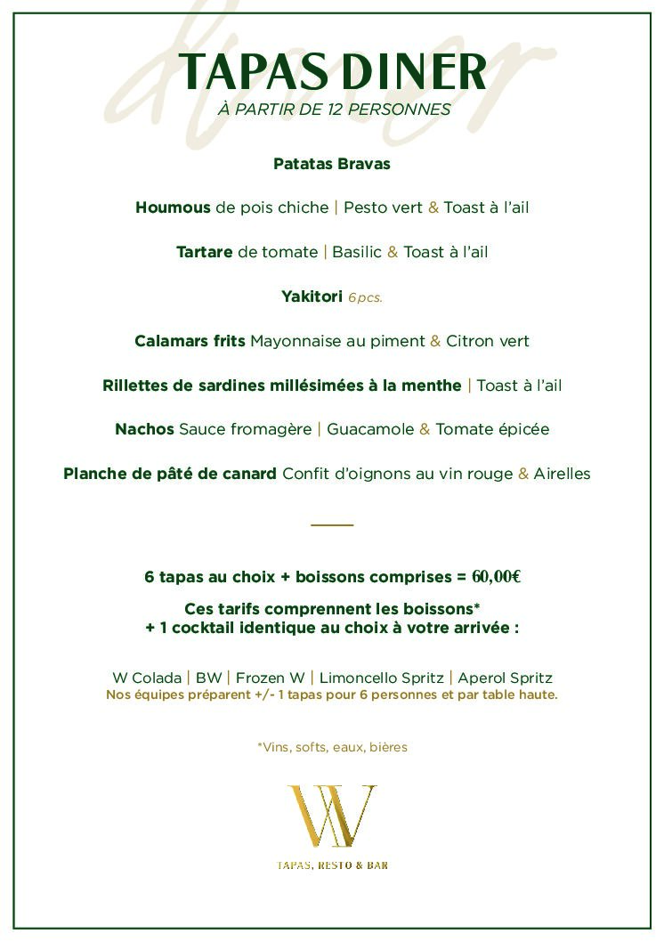 Rassemblez vos proches autour de notre Tapas Dîner, une formule conviviale pensée pour les groupes à partir de 12 personnes à Charleroi. Partagez une sélection de tapas généreuses et savoureuses, allant des incontournables patatas bravas aux créations maison comme les yakitori, les calamars frits ou encore les rillettes de sardines à la menthe. Une expérience gourmande où chacun picore, découvre et se fait plaisir. Composez votre soirée avec 6 tapas au choix, accompagnées d’un forfait boissons inclus pour profiter pleinement du moment sans contrainte. Dès votre arrivée, démarrez en douceur avec un cocktail de bienvenue avant de laisser place à une ambiance détendue, idéale pour célébrer un afterwork ou un événement privé.